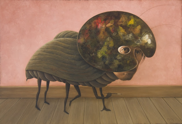 El cambio de tono para esta exposición, ya declarado en su muestra del año pasado, es evidente: el tránsito de la solemnidad y una nostalgia relamida hacia el humor, el recreo, y el extrañamiento de aire surrealista que provee un puente que se estrecha hasta sus trabajos de juventud, de fines de los años 70. Avatares del destino me tienen ahora, con entusiasmo, ponderando su nuevo trabajo, tarea que abordo desde la transparencia de un parecer que es solo eso: una opinión basada en una atenta (y abiertamente prejuiciada) mirada a su recorrido, sin la pretensión de un veredicto crítico rancio, ni las conjeturas predecibles de un texto de encargo, o peor aún, haciendo alarde de un dictamen pontificante.
