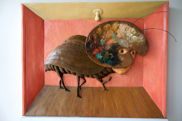 Al igual que aquella escultura la mayoría de piezas que componen esta muestra tiene antecedentes en diversas telas y ensamblajes de su autoría, una forma natural que desde siempre ha empleado para desatacar sus intereses, reinventando sus propias quimeras para potenciar sus sentidos. Así reaparecen aquí versiones tridimensionales de álter egos como El Solitario George (2009) y aquella metamorfosis en alimaña que encierra el retruécano kafkiano Gregorio Tzantza (también 2009, o en sus versiones como Bicho del 2008). Igual sucede con Ruth La Acróbata (2010) y El Hombre Elefante (2004), que se sintonizan con varias otras obras que pueblan su trayectoria y que pueden hablar tanto de aquellas memorias del circo, improntas de infancia, así como de la atracción por lo bizarro que encontramos particularmente en los inicios de su carrera.