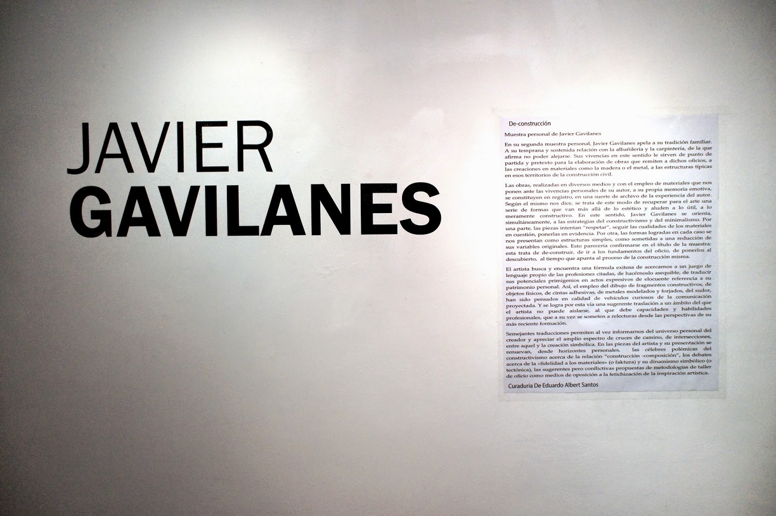 Las obras, realizadas en diversos medios y con el empleo de materiales que nos ponen ante las vivencias personales de su autor, a su propia memoria emotiva, se constituyen en registro, en una suerte de archivo de la experiencia del autor. Según el mismo nos dice, se trata de este modo de recuperar para el arte una serie de formas que van más allá de lo estético y aluden a lo útil, a lo meramente constructivo. En este sentido, Javier Gavilanes se orienta, simultáneamente, a las estrategias del constructivismo y del minimalismo. Por una parte, las piezas intentan “respetar”, seguir las cualidades de los materiales en cuestión, ponerlas en evidencia. Por otra, las formas logradas en cada caso se nos presentan como estructuras simples, como sometidas a una reducción de sus variables originales. Esto parecería confirmarse en el título de la muestra: esta trata de de-construir, de ir a los fundamentos del oficio, de ponerlos al descubierto, al tiempo que apunta al proceso de la construcción misma.